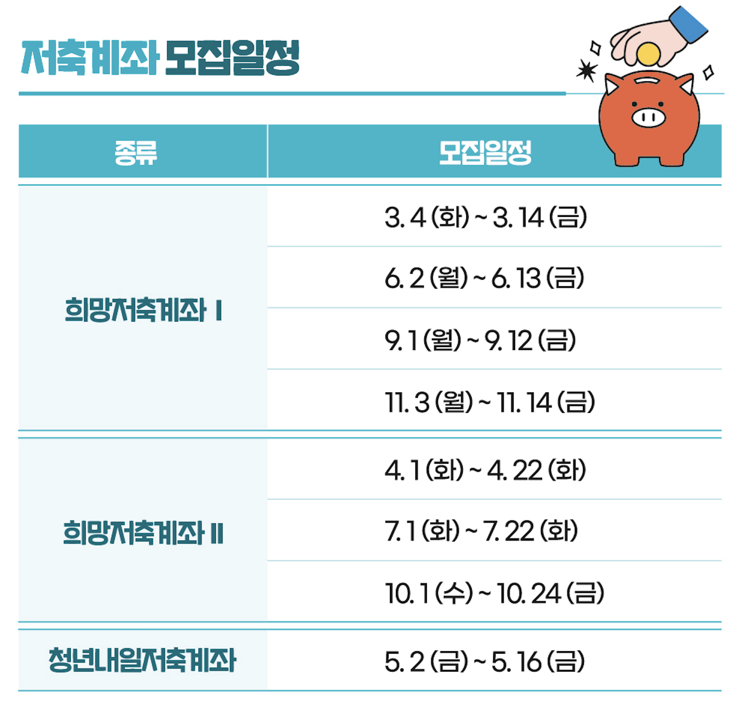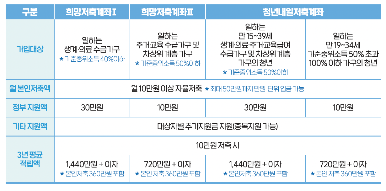 | 희망저축계좌Ⅱ | 주거·교육급여 수급 가구 및 차상위계층 중 근로·사업소득이 있는 가구 | 매월 본인 저축액 10만원에 대해 10만원 매칭 |