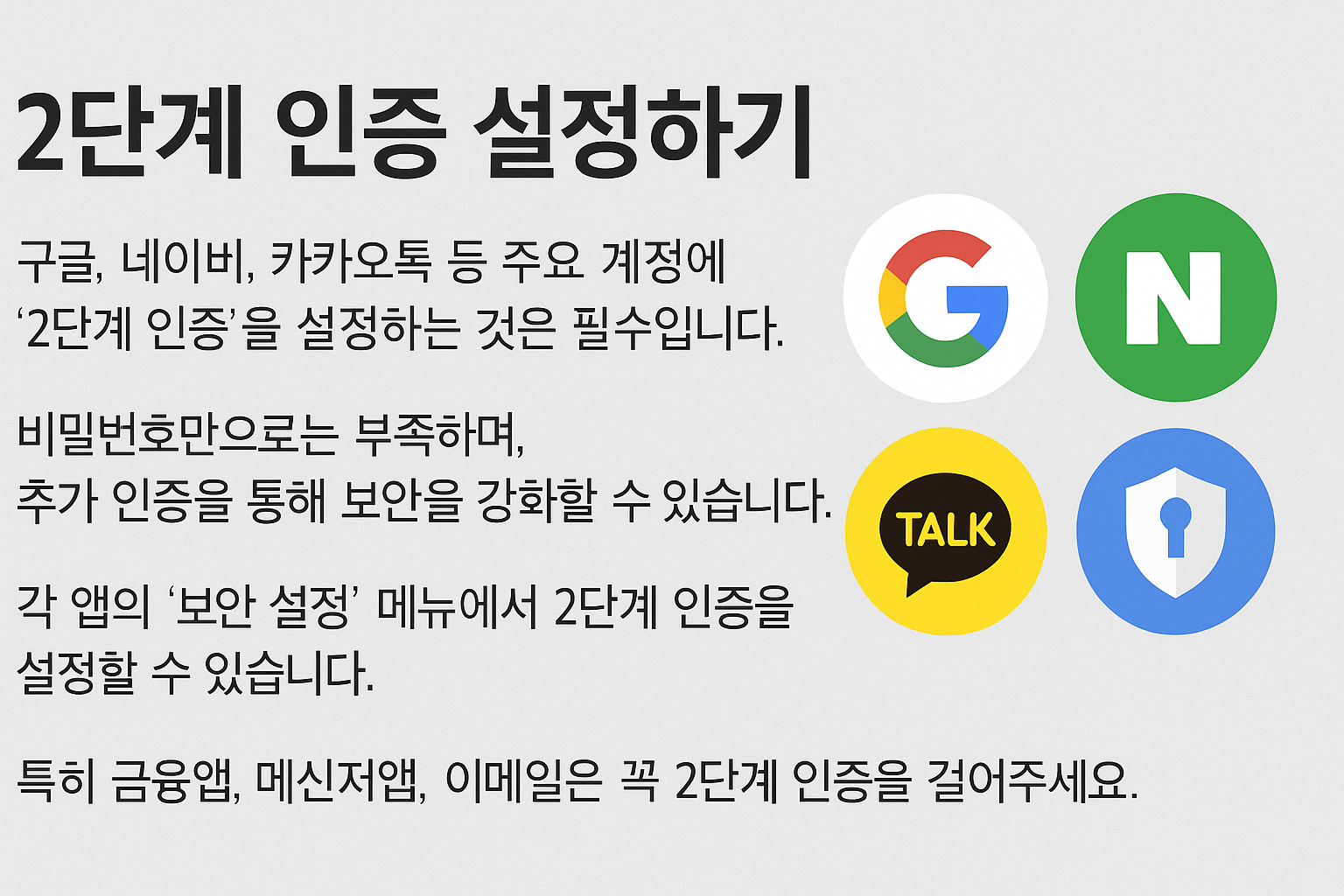 구글, 네이버, 카카오톡 등 주요 계정에 '2단계 인증'을 설정하는 것은 필수입니다.