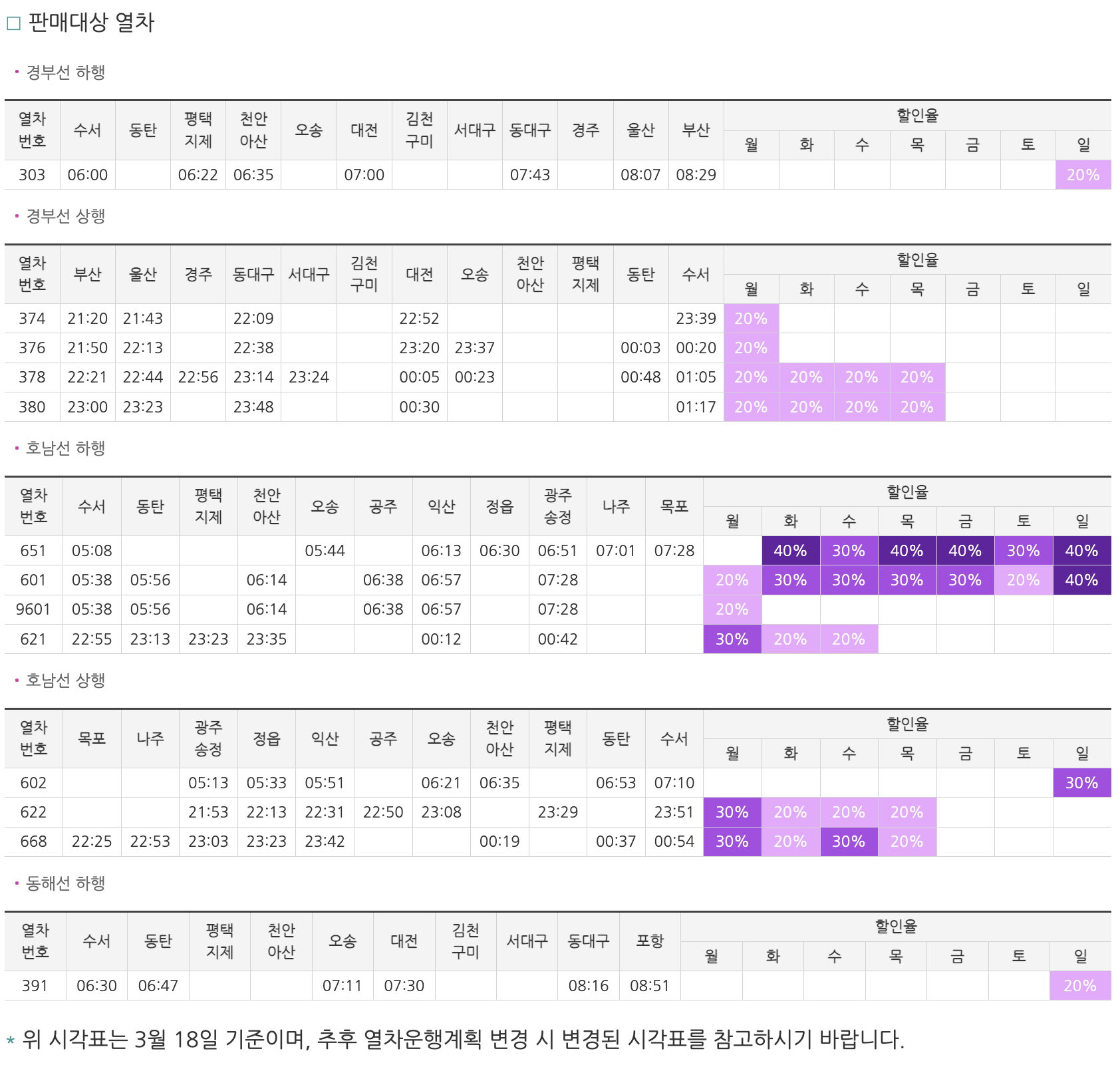 할인 적용 노선은 수서↔부산, 수서↔목포 노선의 일부 열차에 한정되며, 할인율과 적용 열차는 날짜와 시간에 따라 다를 수 있습니다.